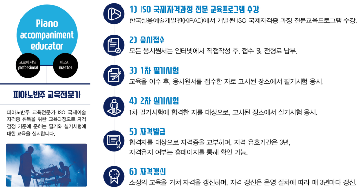 ISO 17024 International Art Qualification "ÇǾƳë¹ÝÁÖ ±³À°Àü¹®°¡¡° (piano accompaniment educator) ÀÚ°Ý Ãëµæ °úÁ¤ ¾È³»ÀÔ´Ï´Ù. ⠀ ÇǾƳë¹ÝÁÖ ±³À°Àü¹®°¡ ÀÚ°Ý Ãëµæ °úÁ¤Àº À§¿Í °°ÀÌ, ±³À°¼ö° -> ½ÃÇèÀÀ½ÃÁ¢¼ö ->1Â÷, 2Â÷½ÃÇè ->ÀÚ°ÝÁõ ¹ß±ÞÀÇ °úÁ¤À¸·Î ÁøÇàµÇ¾îÁý´Ï´Ù. ⠀ 1Â÷ Çʱâ½ÃÇè°ú 2Â÷ ½Ç±â½ÃÇèÀº ¿ÀÇÁ¶óÀÎÀ¸·Î ÁøÇàµÇ¾îÁý´Ï´Ù. ⠀ °¨»çÇÕ´Ï´Ù.